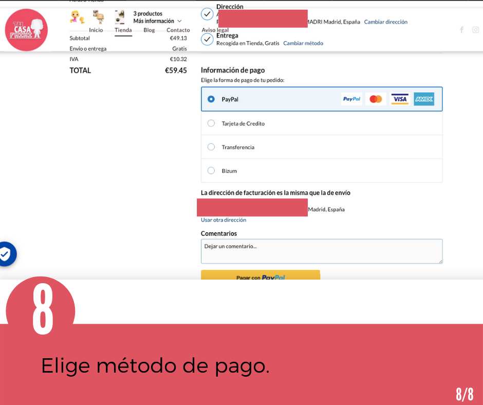 - Si vives en Madrid, puedes colocar “ Recogida en tienda” y venir a nuestra tienda de Madrid a recogerlo.